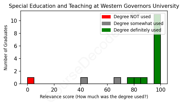 The verdict? Significantly above average. Overall, with an average relevance score of 85%, Special Education and Teaching graduates from Western Governors University have a much higher likelihood (+18%) of finding work in this field compared to the average graduate across all fields: