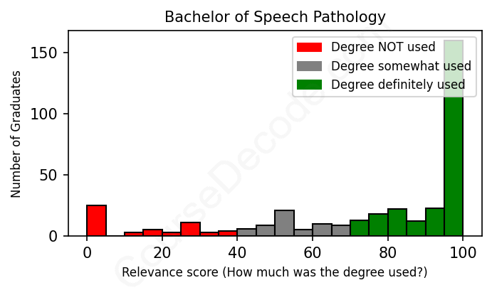 The verdict? Above average. Overall, with an average relevance score of 76%, Speech Pathology graduates have a higher likelihood (+9%) of finding work in this field compared to the average graduate across all fields: