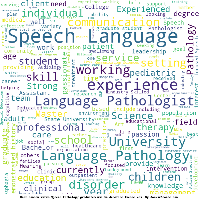 Here is a visual representation of the most common words seen in the "about" section of LinkedIn profiles who have a Bachelor degree in Speech Pathology. This may or may not be useful: