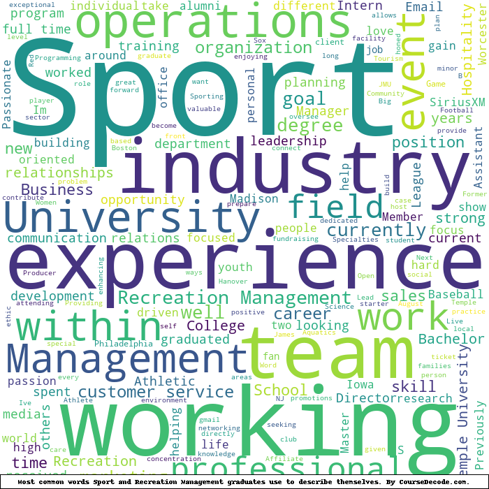 Here is a visual representation of the most common words seen in the "about" section of LinkedIn profiles who have a Bachelor degree in Sport and Recreation Management (this is across all Sport and Recreation Management graduates we've analyzed, not just those who went to Temple University). This may or may not be useful:
