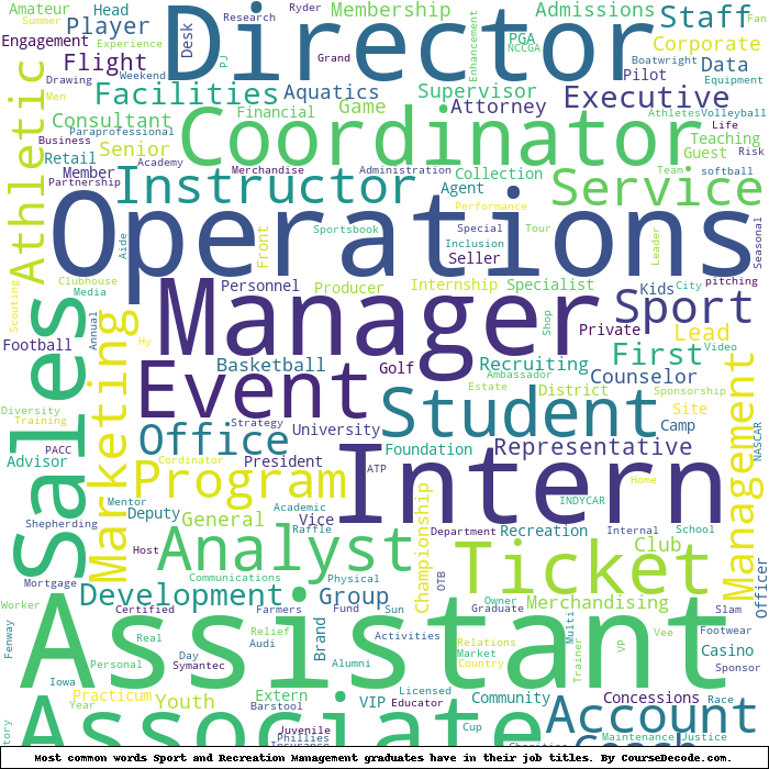 Here is a visual representation of the most common words in job titles for Sport and Recreation Management graduates (this is across all Sport and Recreation Management graduates we've analyzed, not just those who went to Temple University):