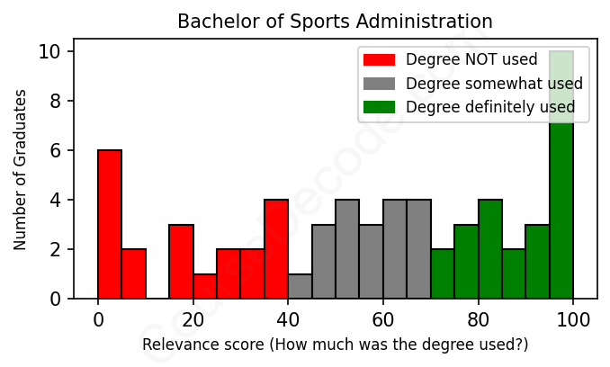 The verdict? Significantly below average. Overall, with an average relevance score of 56%, Sports Administration graduates have a much lower likelihood (-11%) of finding work in this field compared to the average graduate across all fields: