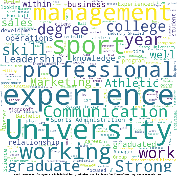 Here is a visual representation of the most common words seen in the "about" section of LinkedIn profiles who have a Bachelor degree in Sports Administration. This may or may not be useful: