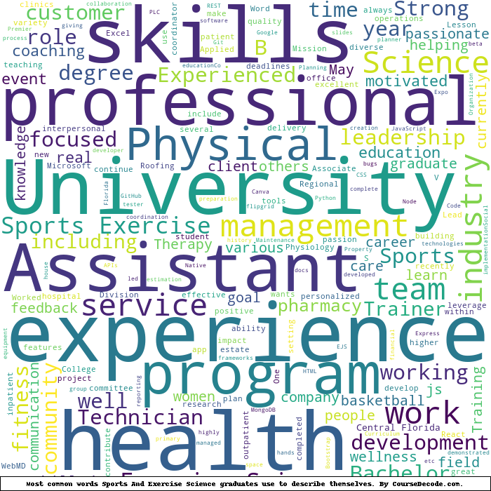 Here is a visual representation of the most common words seen in the "about" section of LinkedIn profiles who have a Bachelor degree in Sports And Exercise Science (this is across all Sports And Exercise Science graduates we've analyzed, not just those who went to University of Central Florida). This may or may not be useful:
