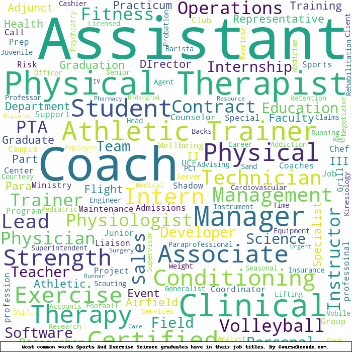 Here is a visual representation of the most common words in job titles for Sports And Exercise Science graduates (this is across all Sports And Exercise Science graduates we've analyzed, not just those who went to University of Central Florida):
