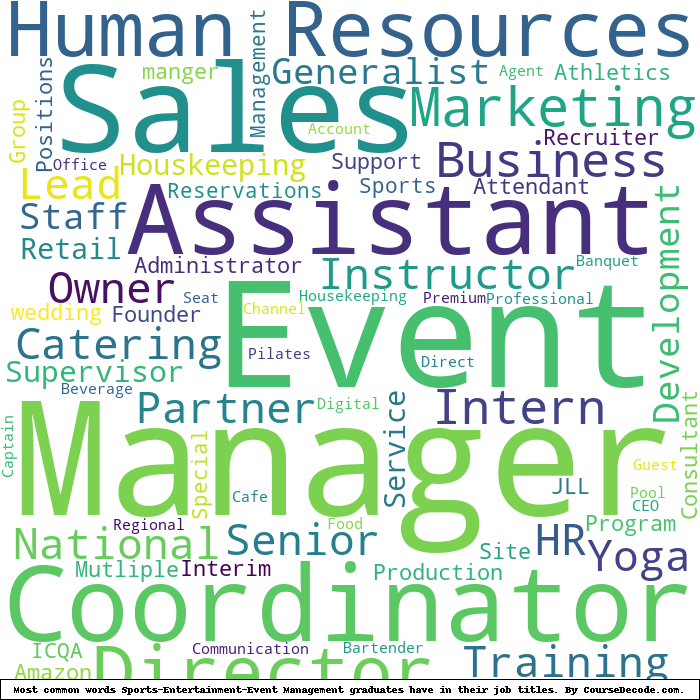 Here is a visual representation of the most common words in job titles for Sports-Entertainment-Event Management graduates (this is across all Sports-Entertainment-Event Management graduates we've analyzed, not just those who went to Johnson & Wales University):