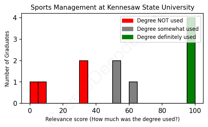 The verdict? Below average. Overall, with an average relevance score of 57%, Sports Management graduates from Kennesaw State University have a lower likelihood (-10%) of finding work in this field compared to the average graduate across all fields: