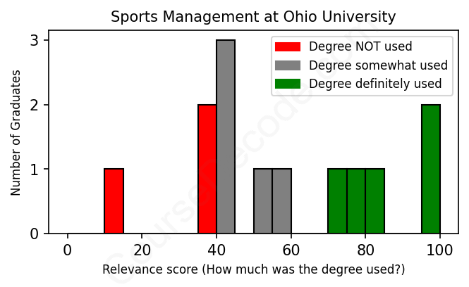 The verdict? Below average. Overall, with an average relevance score of 57%, Sports Management graduates from Ohio University have a lower likelihood (-10%) of finding work in this field compared to the average graduate across all fields: