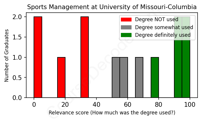 First, some facts. Of the Sports Management graduates from University of Missouri-Columbia we've analyzed , here's how many have used (or NOT used) their degree in their career: