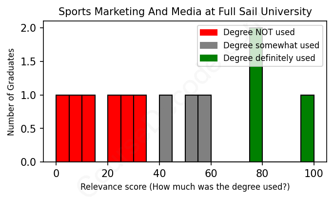 The verdict? Bad. Overall, with an average relevance score of 41%, Sports Marketing And Media graduates from Full Sail University have a substantially lower likelihood (-26%) of finding work in this field compared to the average graduate across all fields:
