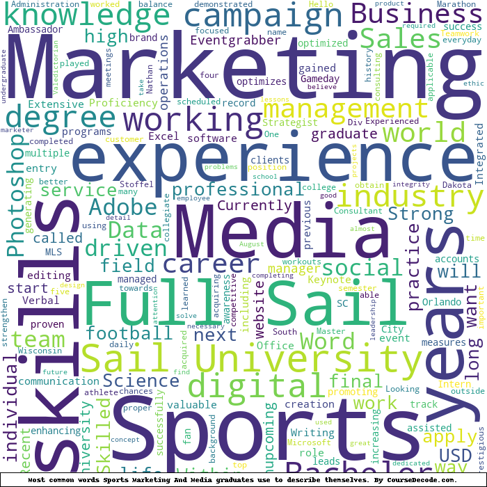 Here is a visual representation of the most common words seen in the "about" section of LinkedIn profiles who have a Bachelor degree in Sports Marketing And Media (this is across all Sports Marketing And Media graduates we've analyzed, not just those who went to Full Sail University). This may or may not be useful: