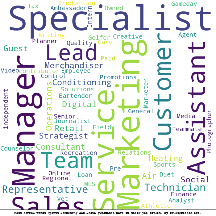 Here is a visual representation of the most common words in job titles for Sports Marketing And Media graduates (this is across all Sports Marketing And Media graduates we've analyzed, not just those who went to Full Sail University):