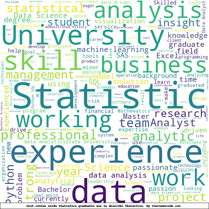 Here is a visual representation of the most common words seen in the "about" section of LinkedIn profiles who have a Bachelor degree in Statistics. This may or may not be useful: