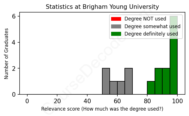 The verdict? Significantly above average. Overall, with an average relevance score of 81%, Statistics graduates from Brigham Young University have a much higher likelihood (+14%) of finding work in this field compared to the average graduate across all fields: