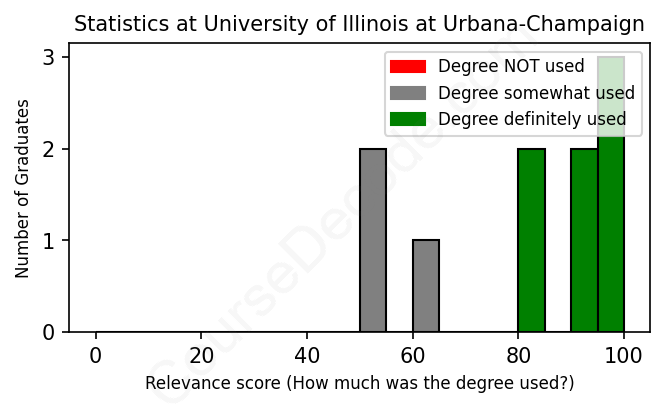 The verdict? Significantly above average. Overall, with an average relevance score of 81%, Statistics graduates from University of Illinois at Urbana-Champaign have a much higher likelihood (+14%) of finding work in this field compared to the average graduate across all fields: