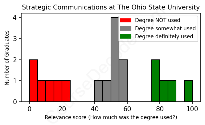 The verdict? Bad. Overall, with an average relevance score of 46%, Strategic Communications graduates from The Ohio State University have a substantially lower likelihood (-21%) of finding work in this field compared to the average graduate across all fields: