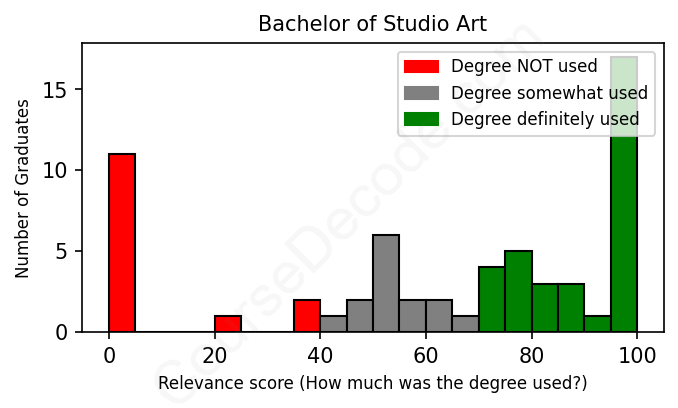 The verdict? Slightly below average. Overall, with an average relevance score of 62%, Studio Art graduates have a slightly lower likelihood (-5%) of finding work in this field compared to the average graduate across all fields:
