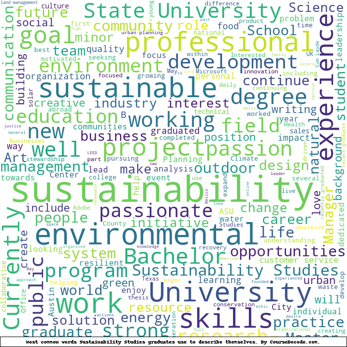 Here is a visual representation of the most common words seen in the "about" section of LinkedIn profiles who have a Bachelor degree in Sustainability Studies. This may or may not be useful: