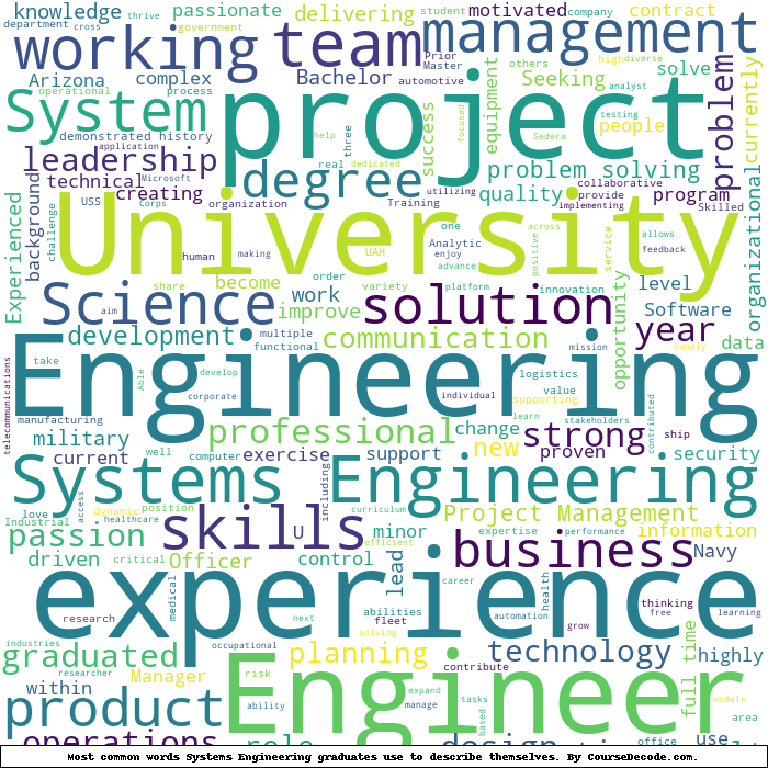 Here is a visual representation of the most common words seen in the "about" section of LinkedIn profiles who have a Bachelor degree in Systems Engineering. This may or may not be useful: