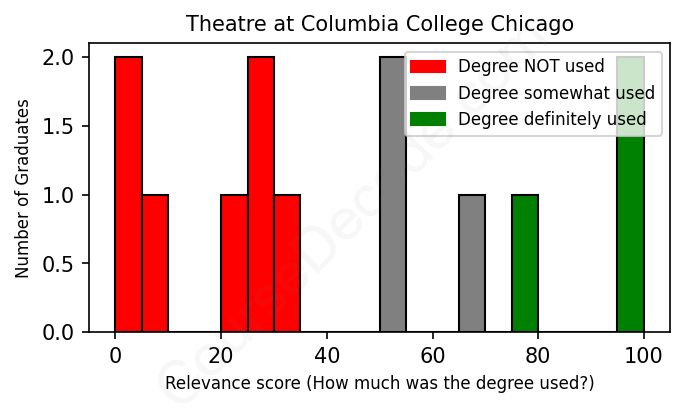 The verdict? Bad. Overall, with an average relevance score of 42%, Theatre graduates from Columbia College Chicago have a substantially lower likelihood (-25%) of finding work in this field compared to the average graduate across all fields: