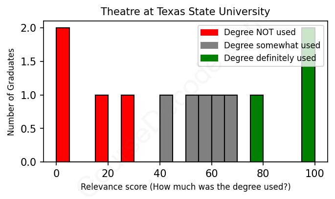 The verdict? Significantly below average. Overall, with an average relevance score of 50%, Theatre graduates from Texas State University have a much lower likelihood (-17%) of finding work in this field compared to the average graduate across all fields: