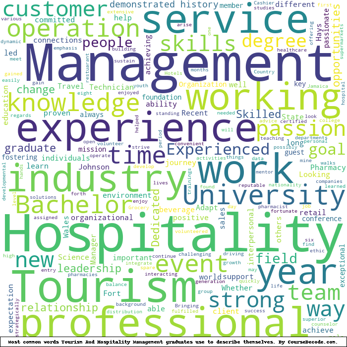 Here is a visual representation of the most common words seen in the "about" section of LinkedIn profiles who have a Bachelor degree in Tourism And Hospitality Management (this is across all Tourism And Hospitality Management graduates we've analyzed, not just those who went to Temple University). This may or may not be useful: