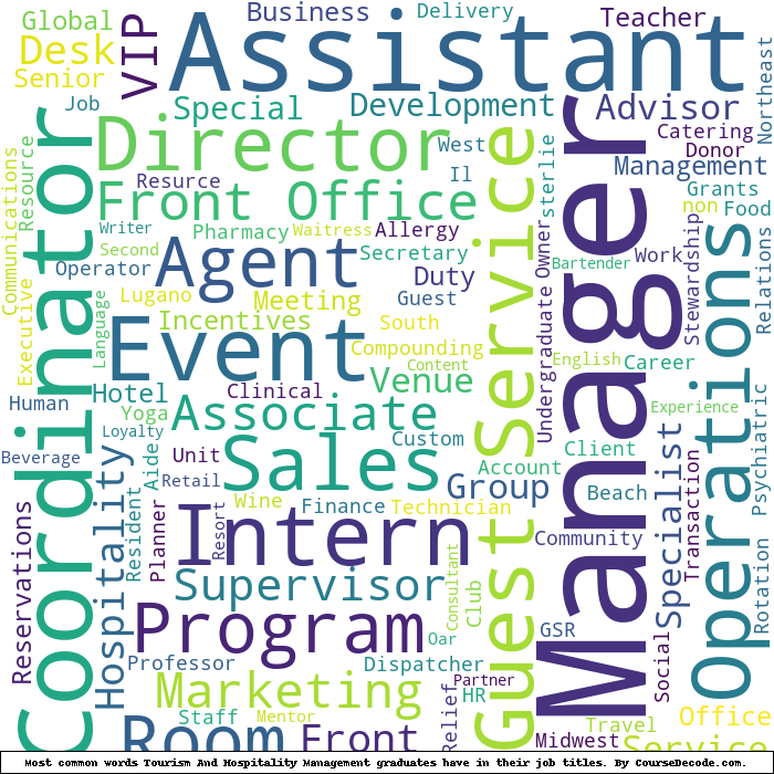 Here is a visual representation of the most common words in job titles for Tourism And Hospitality Management graduates (this is across all Tourism And Hospitality Management graduates we've analyzed, not just those who went to Temple University):