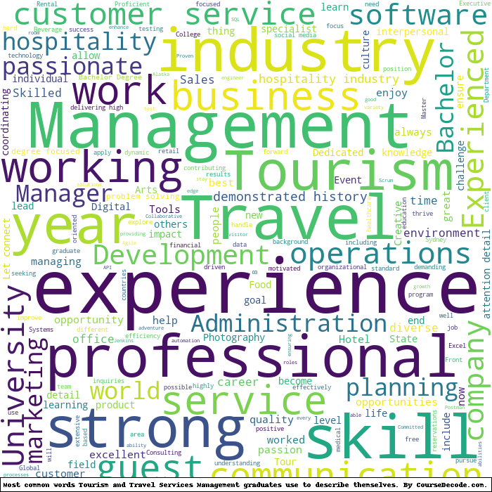 Here is a visual representation of the most common words seen in the "about" section of LinkedIn profiles who have a Bachelor degree in Tourism and Travel Services Management. This may or may not be useful: