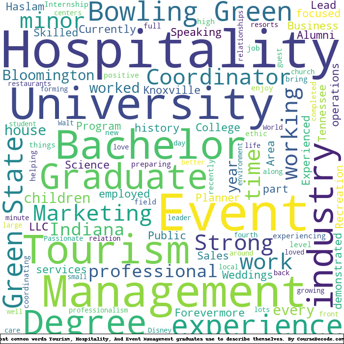 Here is a visual representation of the most common words seen in the "about" section of LinkedIn profiles who have a Bachelor degree in Tourism, Hospitality, And Event Management (this is across all Tourism, Hospitality, And Event Management graduates we've analyzed, not just those who went to Indiana University Bloomington). This may or may not be useful: