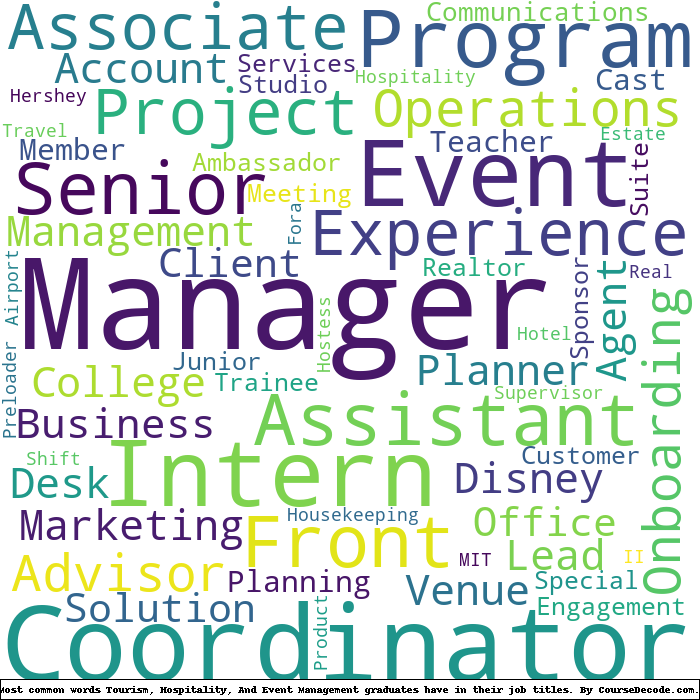 Here is a visual representation of the most common words in job titles for Tourism, Hospitality, And Event Management graduates (this is across all Tourism, Hospitality, And Event Management graduates we've analyzed, not just those who went to Indiana University Bloomington):