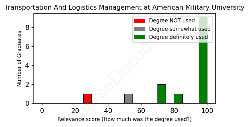 The verdict? Significantly above average. Overall, with an average relevance score of 85%, Transportation And Logistics Management graduates from American Military University have a much higher likelihood (+18%) of finding work in this field compared to the average graduate across all fields: