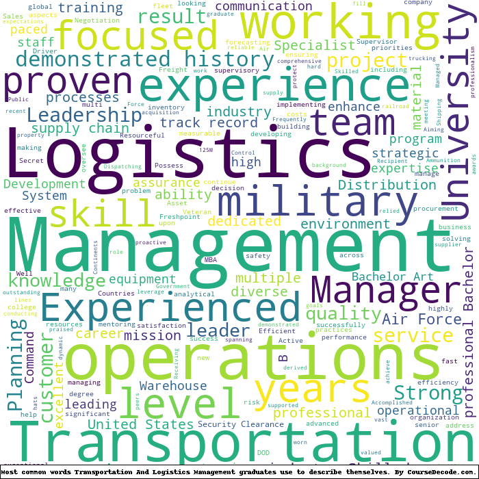 Here is a visual representation of the most common words seen in the "about" section of LinkedIn profiles who have a Bachelor degree in Transportation And Logistics Management (this is across all Transportation And Logistics Management graduates we've analyzed, not just those who went to American Military University). This may or may not be useful: