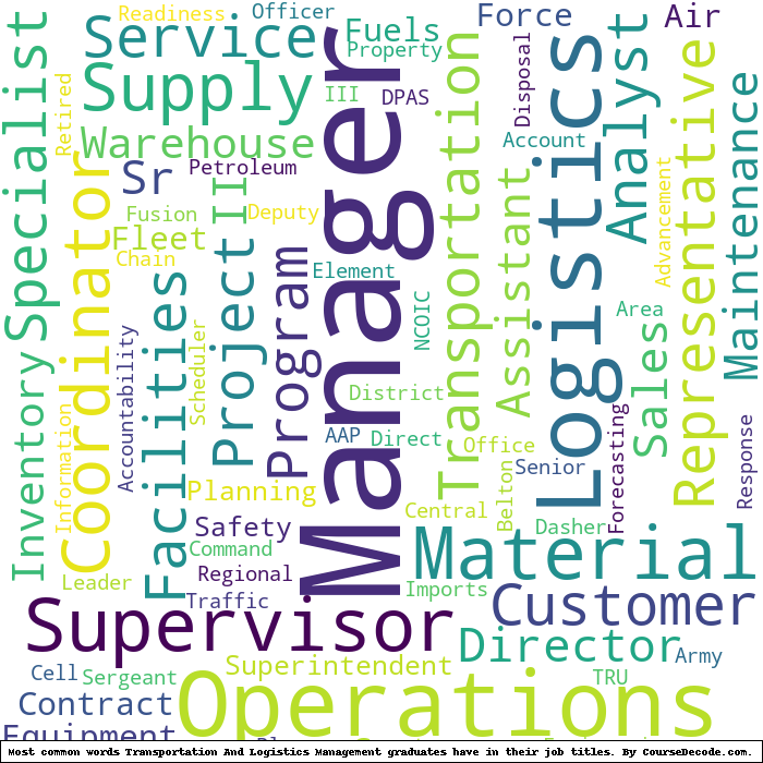 Here is a visual representation of the most common words in job titles for Transportation And Logistics Management graduates (this is across all Transportation And Logistics Management graduates we've analyzed, not just those who went to American Military University):
