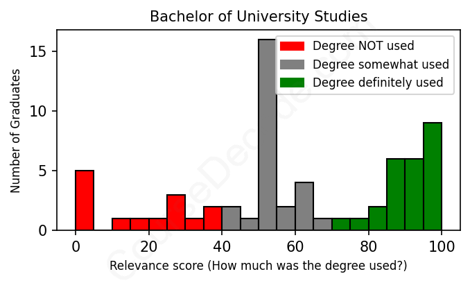 The verdict? Below average. Overall, with an average relevance score of 59%, University Studies graduates have a lower likelihood (-8%) of finding work in this field compared to the average graduate across all fields: