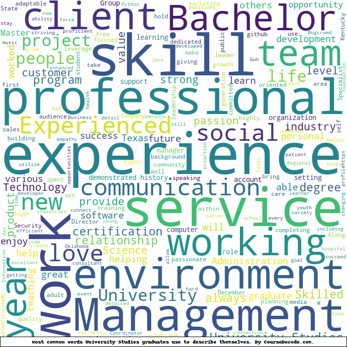 Here is a visual representation of the most common words seen in the "about" section of LinkedIn profiles who have a Bachelor degree in University Studies. This may or may not be useful: