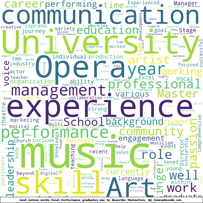 Here is a visual representation of the most common words seen in the "about" section of LinkedIn profiles who have a Bachelor degree in Vocal Performance. This may or may not be useful: