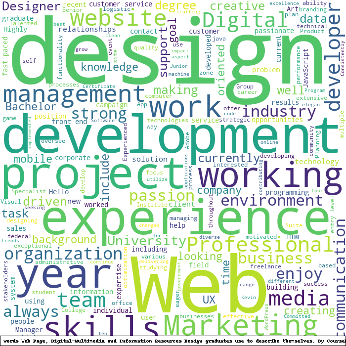 Here is a visual representation of the most common words seen in the "about" section of LinkedIn profiles who have a Bachelor degree in Web Page, Digital-Multimedia and Information Resources Design. This may or may not be useful: