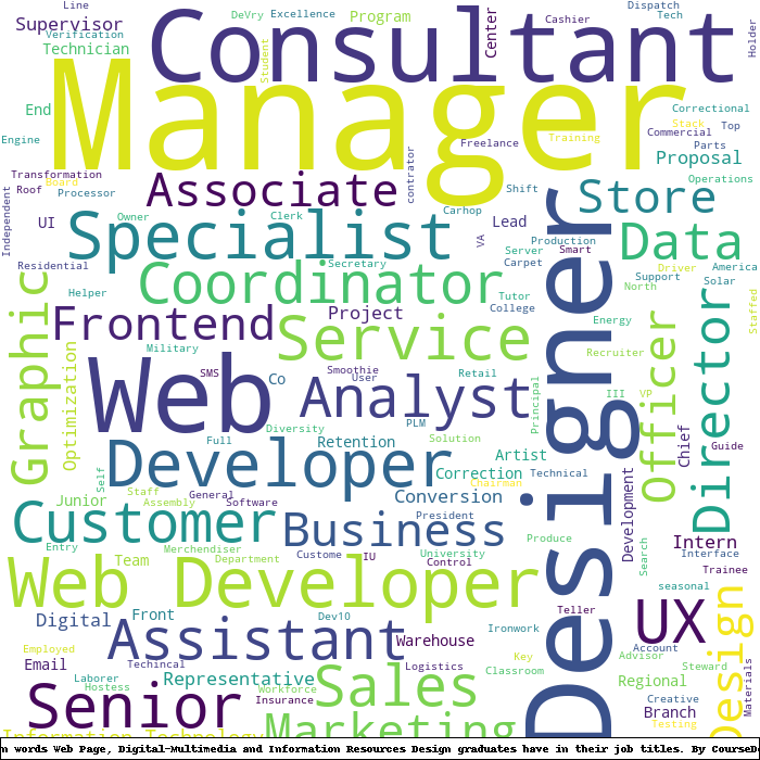 Here is a visual representation of the most common words in job titles for Web Page, Digital-Multimedia and Information Resources Design graduates: