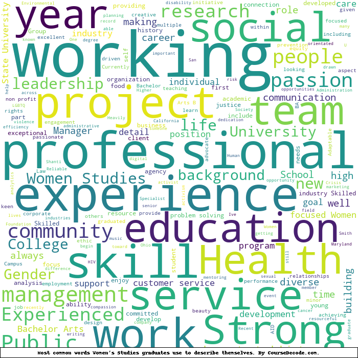 Here is a visual representation of the most common words seen in the "about" section of LinkedIn profiles who have a Bachelor degree in Women's Studies. This may or may not be useful: