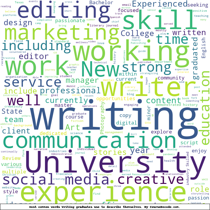 Here is a visual representation of the most common words seen in the "about" section of LinkedIn profiles who have a Bachelor degree in Writing. This may or may not be useful:
