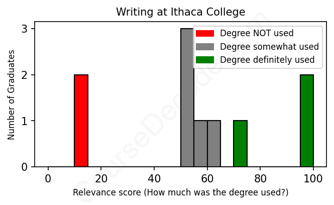 The verdict? Significantly below average. Overall, with an average relevance score of 56%, Writing graduates from Ithaca College have a much lower likelihood (-11%) of finding work in this field compared to the average graduate across all fields: